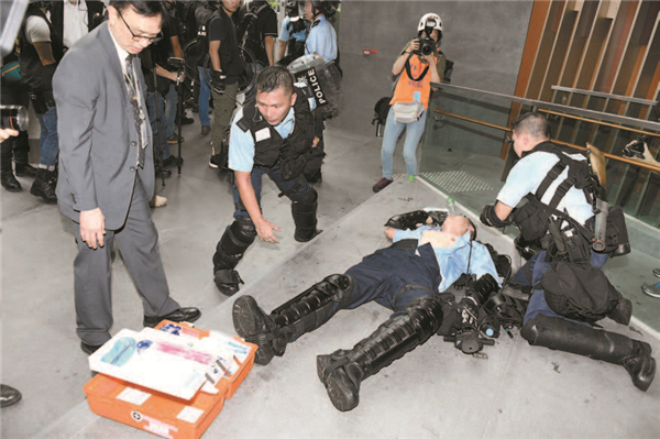 立法會衝突期間,有警員受傷倒地,須接受治療。