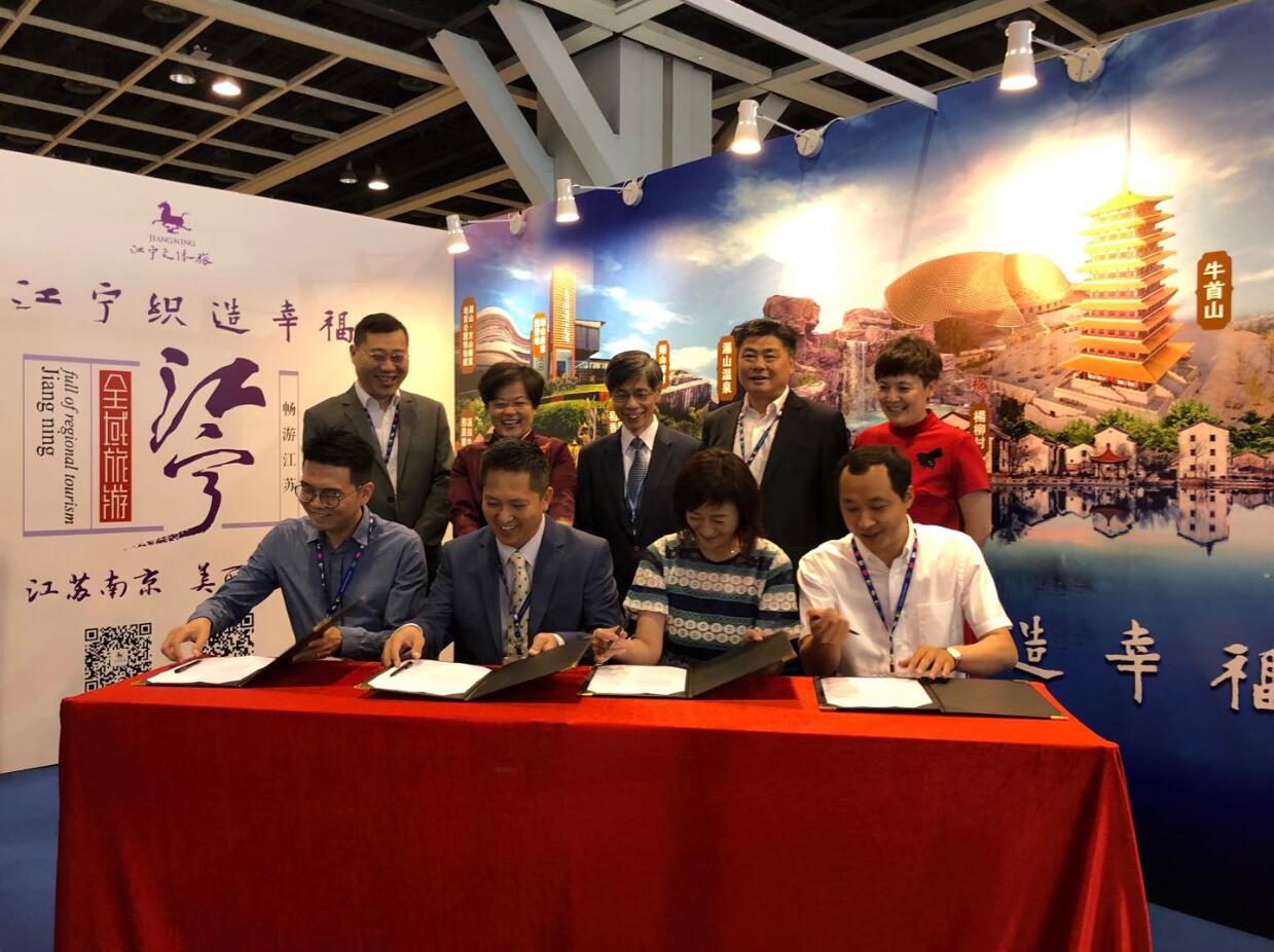 香港兩家旅行社與江寧兩家旅行社現場簽署合作意向書。南京盛世旅遊服務有限公司與怡泰(香港)旅行社有限公司、江蘇湯山國際旅行社有限公司與香港旅行世界有限公司將通過合作加強香港與南京江寧兩地旅客相互輸送,定制個性化旅行線路,共同推動兩地跨境旅遊發展。