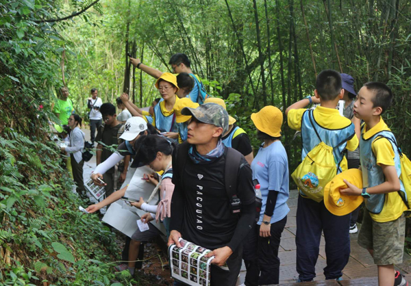 中學生在丹霞山研學辨認各類植物