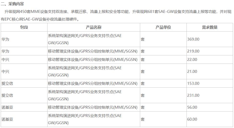 公告信息显示,本次集采需升级现网450套MME设备支持双连接、承载迁移、流量上报和安全等功能,升级现网681套SAE-GW设备支持流量上报等功能,并对现有EPC核心网SAE-GW设备补偿流量处理硬件。上述业内人士告诉中证君,MME约15万一套;SAE-GW约20万一套,总计采购金额约2亿元。