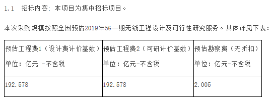6月10日,中国移动发布《2019年5G一期无线工程设计及可行性研究服务集中采购招标公告》,其中,预估工程费1(设计费计价基数)为192.58亿元(不含税),预估工程费2(可研计价基数)为192.58亿元(不含税),预估勘察费(无折扣)为2亿元(不含税)。