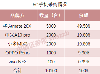 其中5G手机10100台,包括华为Mate20X 5000台、中兴A10Pro 2000台、小米MIX3 2000台、OPPO RENO 1000台、Vivo NEX 100台;5G CPE终端7000台,包括华为5G CPE Pro 5000台,中兴5G CPE 2000台。