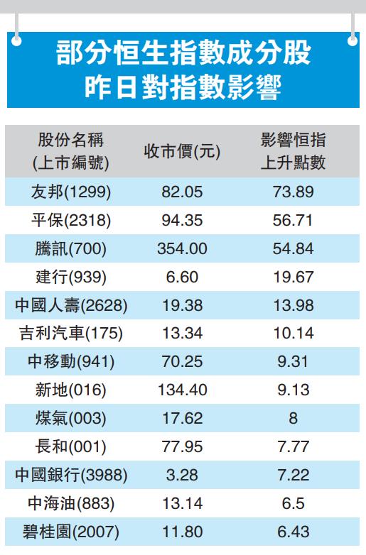 騰訊(700)昨以全日高位354元收市,升1.9%,為一個月來首次重上350水平。其他重磅股跟隨大市向上,友邦保險(1299)升2.5%;中國平安(2318)升3.7%,建設銀行(939)及中海油(883)升0.9%;中移動(941)升0.7%。息口敏感的地產股跑贏大市,恒基地產(012)升2.8%,信和置業(083)升2.7%,新世界發展(017)及恒隆地產(101)升2.3%。