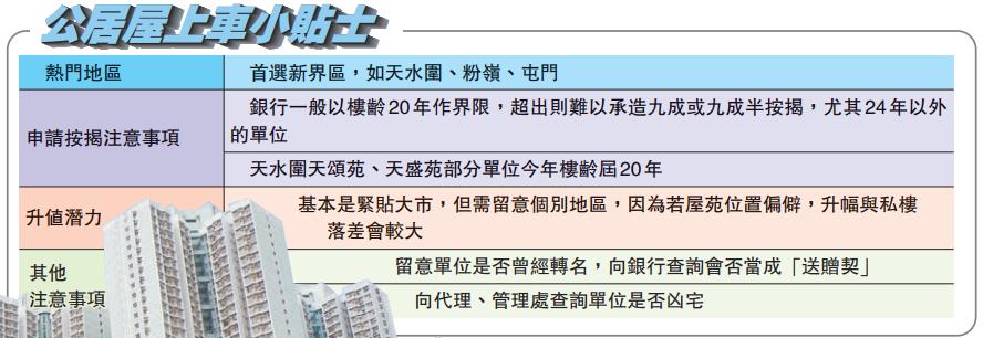 本港樓價屢創新高,價值400萬元甚至500萬元以下的私樓盤源幾乎銷聲匿跡,要上車還有什麼法子?新居屋「大抽獎」不是人人有份,二手公屋居屋可能是一抹曙光。環顧熱門公屋居屋上車地區,天水圍、粉嶺、屯門、黃大仙等放盤實況和交投情況如何?做公屋居屋業主和申請按揭有何注意事項?不妨參考以下貼士。