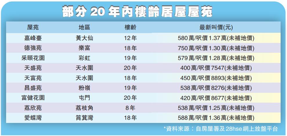 講到按揭,伍耀祖特別提醒,天水圍6個居屋屋苑,部分樓齡今年已屆20年,包括天頌苑及天盛苑,當中特定座數在1999年入伙,而天富苑大部分座數均在2001年入伙,樓齡也接近20年。準買家如瞄準天水圍居屋作上車途徑,就宜把握機會入市,因為樓齡一過20年,做足九成和25年按揭的難度就大大提升了。