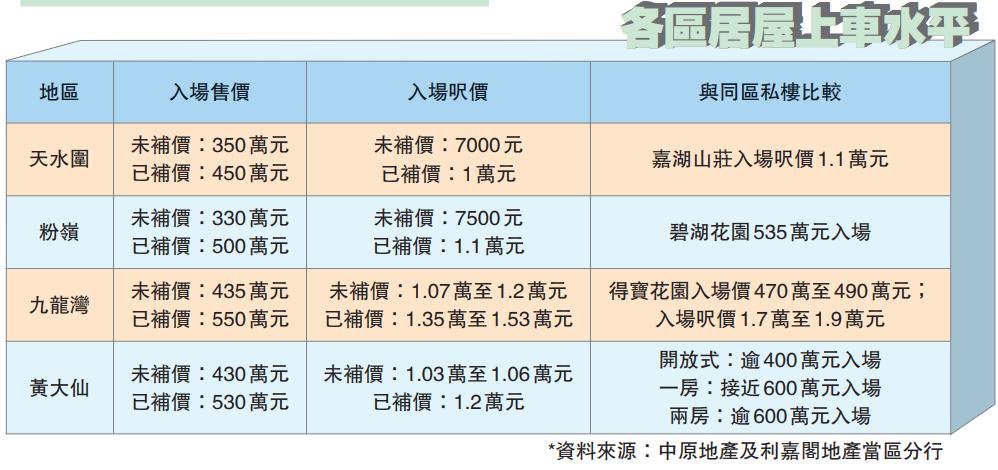 各區的入場費與私樓折讓情況各有不同,抽取數個較熱門的公居屋上車地區作為例子,天水圍居屋平絕全港,未補地價居屋單位最低每方呎僅約7000元,即最低300餘萬元已可上車。