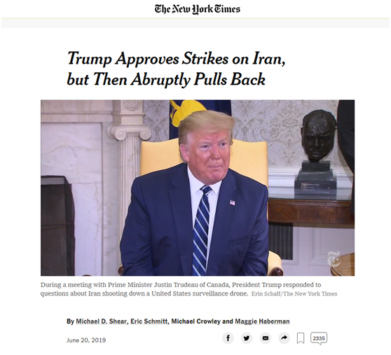 【香港商報網訊】剛剛,就在美國主流媒體密集報道特朗普說“很難相信伊朗是故意(擊落美軍無人機)”,給事件降溫的時候,《紐約時報》發出猛料——特朗普已下令軍事打擊伊朗,但隨後撤回了命令。