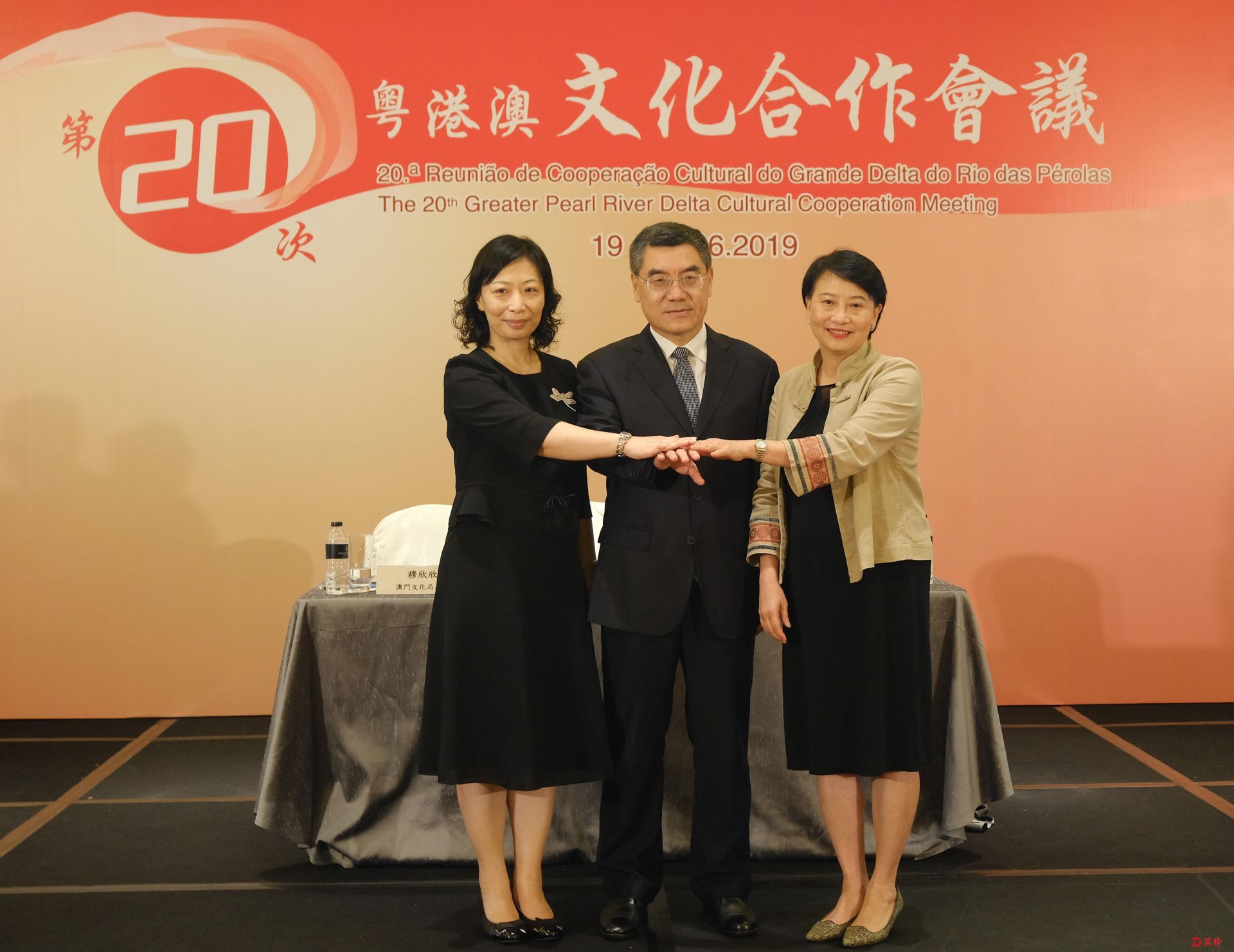 民政事務局常任秘書長謝淩潔貞(右)今日(六月二十日)與廣東省文化廳廳長汪一洋(中)和澳門文化局局長穆欣欣(左),出席在澳門舉行的粵港澳文化合作第二十次會議。