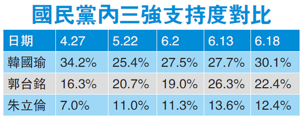據悉,由於國民黨初選民調將有15%黨內互比,因此民調特別詢問民眾支持哪位國民黨候選人,結果依序為韓國瑜30.1%、郭台銘22.4%、朱立倫12.4%、周錫瑋0.9%、張亞中0.5%,韓領先郭約7.7個百分點。