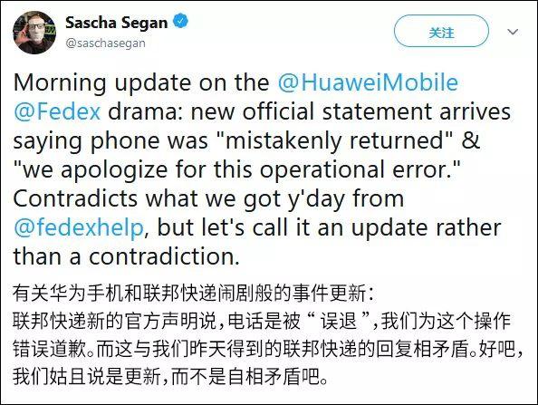 當地時間6月22日,PC Magazine首席分析師塞根(Sascha Segan)在其社交媒體更新了上述事件進展,稱聯邦快遞再度發來聲明,表示華為手機是被“錯誤地退回”給發件人,“我們為此次錯誤操作道歉”。