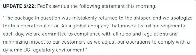 聯邦快遞:“正被討論的包裹是被錯誤地退還給發件人,我們對此錯誤操作道歉。”