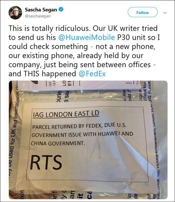 “太荒謬了,我們的英國作者想把他的華為P30(Pro)寄給我們,這樣我就可以測評一些東西。這不是一部新手機,而是我們現有的手機,屬于我們公司,只是在辦公室之間寄送。但這種事就是發生了。@FedEx。