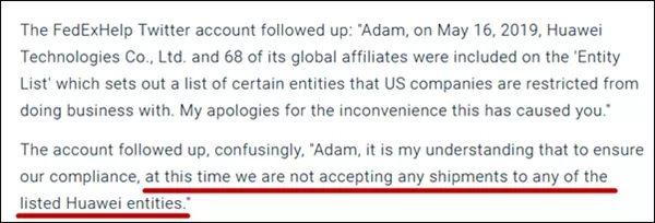 而聯邦快遞客服賬號“FedExHelp”也在推特上聯系到史密斯,表示“5月16日美國將華為及其68個子公司列入‘實體清單’,美國公司被限制了與清單所列某些實體的業務往來,給您帶來不便深感抱歉。”