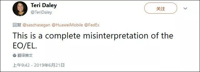在塞根首次發布推文后,華為美國公司發言人泰瑞·戴利(Teri Daley)便回復推文稱,聯邦快遞拒投遞華為手機,“這完全是對(美國)行政命令和實體名單的誤讀。”