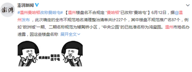 據傳曼哈頓小區擬改名曼哈屯,歐洲城已改為矮橋凳……在官方的主導之下,改名的星星之火,全國燎原,於是各城各地都列出了改名清單。但意想不到的是,熱笑話半年來漸漸變幻成了冷幽默,各類吐槽也如期而至。