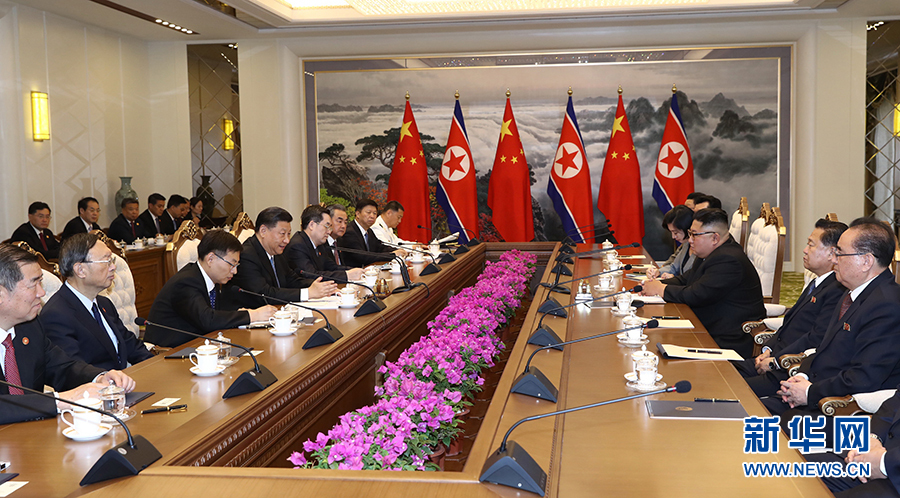 20日下午,锦绣山迎宾馆1号楼会谈厅。习近平总书记同金正恩委员长进行了长达100分钟的会谈,就半岛问题进行了沟通。