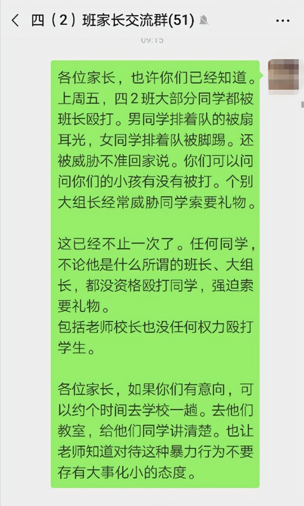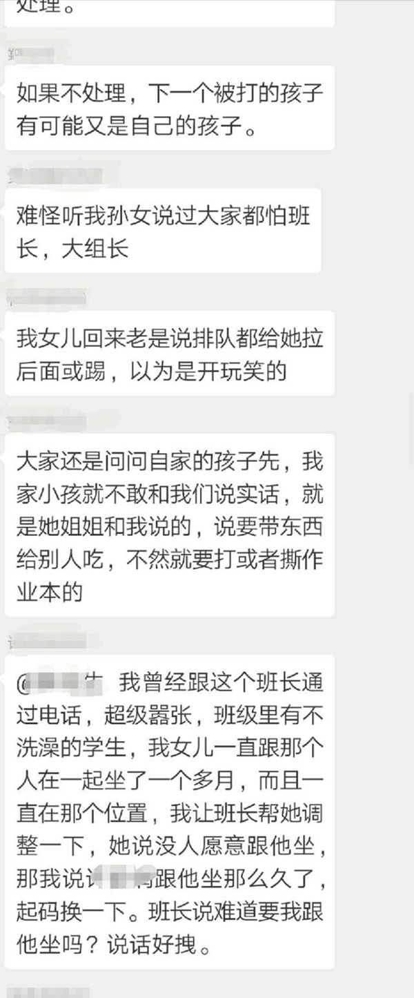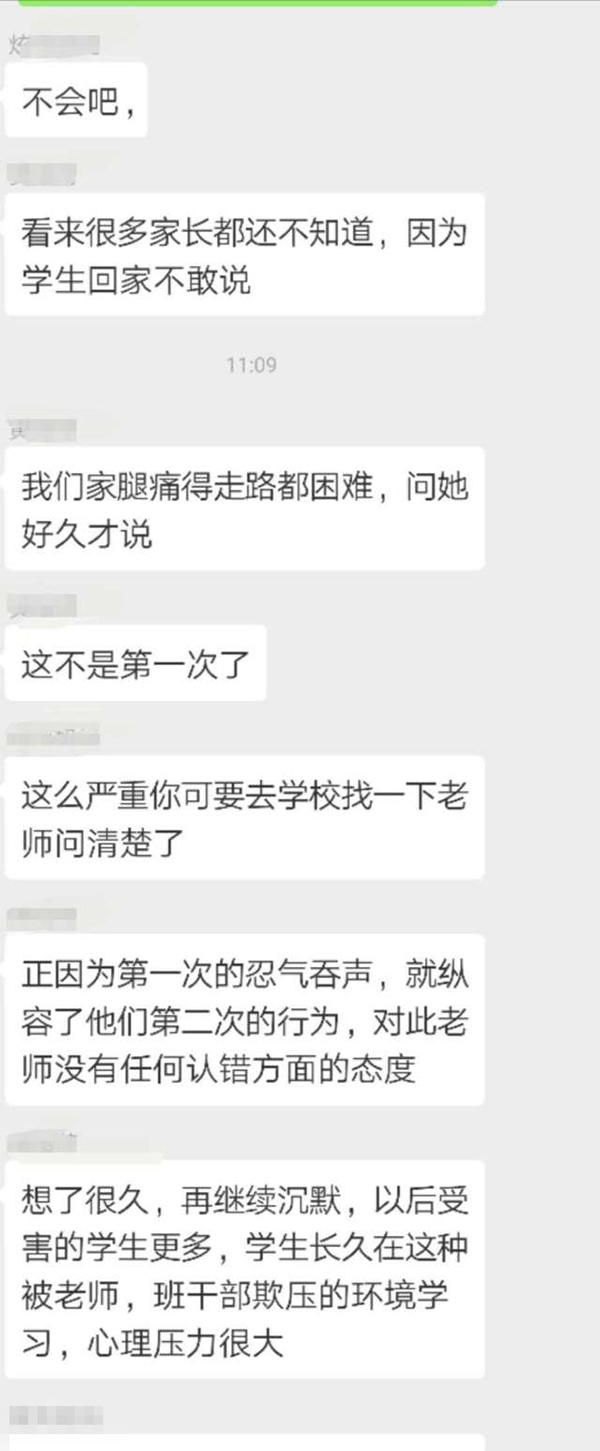 王先生把女兒的情況反映到家長群里,結果群里的家長紛紛表示,自己的孩子也反映當天遭遇到班長的毆打,有的孩子甚至“腿疼得難以走路”。