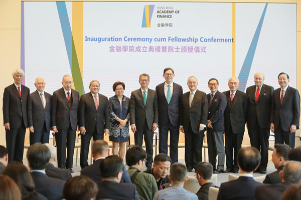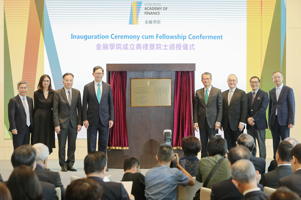 由金管局牽頭成立的金融學院昨在港成立,財政司司長兼金融學院榮譽院長陳茂波(右四)與香港金融管理局總裁兼金融學院董事會主席陳德霖(左四)等嘉賓出席成立典禮暨院士頒授儀式。中新社