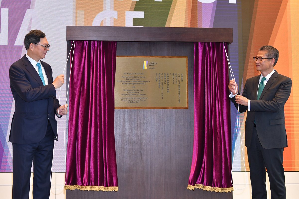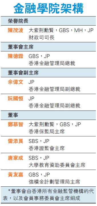 金融學院昨正式成立,成立典禮由財政司司長陳茂波及金管局總裁陳德霖共同主持。金融學院將會向金融業高層招攬會員,學院不提供專業或職業培訓,而是旨在透過舉辦研討會等,為本港培育金融領袖人才,以及擴闊會員的國際及跨界別視野。銀行業公會、中銀香港及汇豐銀行均對成立金融學院表示支持。