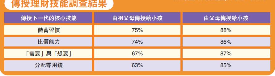 調查亦涉及父母一輩對祖父母一輩理財觀念的看法,在理財價值觀和教育方面,72%受訪家長認為其父母是好的理財榜樣,尤其是在制定預算(65%)、良好的儲蓄習慣(60%)及理性消費(58%)方面。