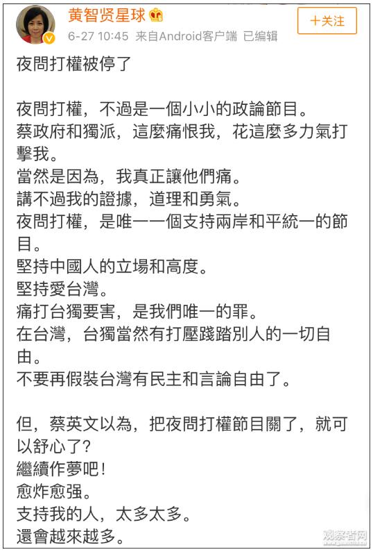 27日上午,黃智賢本人證實了《夜問打權》將被停播的傳言。她同時更新微博和臉書做出回應,稱蔡當局和“台獨”分子這么恨她,花這么大力氣打擊她,正是因為自己“真正讓他們痛了”,他們“講不過我的證據、道理和勇氣”。“但蔡英文以為把節目關了,就可以舒心了?繼續做夢吧!”