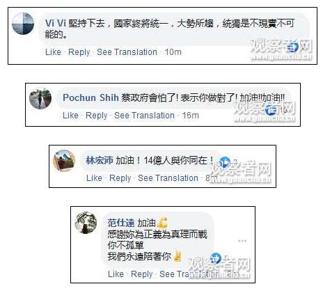 她于20日再次在臉書上發聲,提到自己在廈門演講時支持“和平統一、一國兩制”,然后“台獨”分子就要吊銷她的台灣“護照”,并把她趕出台灣。她認為回應這種人是在“浪費人生”,而且,台灣沒有“護照”,“因為台灣不是一個國家”。