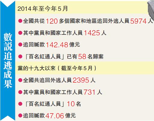 2014年6月27日,中央反腐敗協調小組國際追逃追贓工作辦公室成立,吹響了「有逃必追、一追到底」的號角。截至今年5月,全國共從120多個國家和地區追回外逃人員5974人,其中黨員和國家工作人員1425人,追回贓款142.48億元,「百名紅通人員」已有58名歸案。數據還顯示,黨的十九大以來,截至2019年5月,全國共追回外逃人員2395人,其中黨員和國家工作人員731人,「百名紅通人員」10名,追回贓款47.06億元。