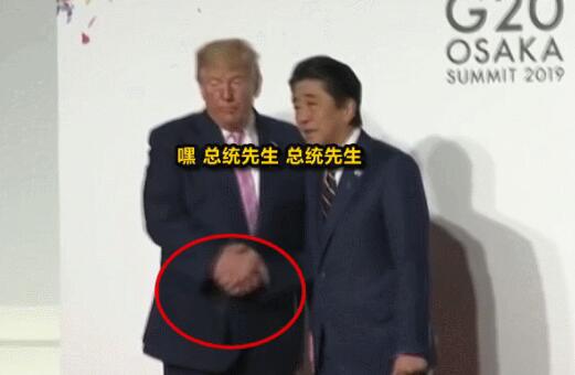 安倍伸出手想要同特朗普握手,但是特朗普卻低頭、掃了眼、假裝沒看見……把頭轉向一邊、“王顧左右而言他”……