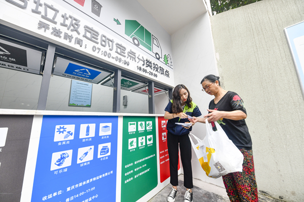 重慶市環衛集團的垃圾分類巡檢員盧興(左一)在為居民提供垃圾分類諮詢服務。新華社