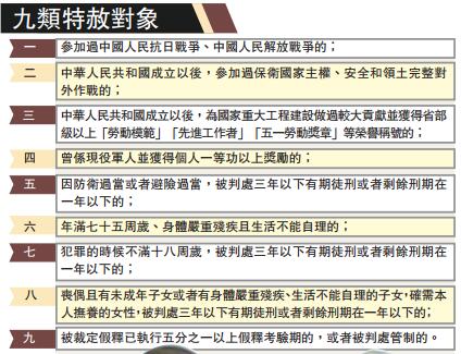 負責人指出,這次特赦的對象中,第一、二、六、七類特赦對象與2015年相同;第三、四、五、八、九類特赦對象是新增加的。其中,第三、四類對象是為國家強大和綜合國力提升,或者鞏固國防、保衛祖國和社會主義現代化建設做出過貢獻。對第五類對象實行特赦,有利於鼓勵人民群眾同違法犯罪作鬥爭,積極參與搶險、救災等工作,在全社會營造見義勇為的良好氛圍。對第八類對象實行特赦,體現了黨和國家對女性的特殊關懷,有利於紓解這類家庭中子女撫養方面面臨的特殊困難。第九類對象已經在社區,社會危險性小。這九類特赦對象包括中國籍罪犯,也包括外國籍罪犯;既包括在監獄、看守所服刑的罪犯,也包括正在進行社區矯正的罪犯。