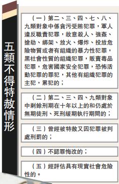 此外,此次特赦還包括五類不得特赦的對象,負責人表示,這次特赦要遵循積極審慎、公平公正、依法辦理與平穩有序四項基本原則。