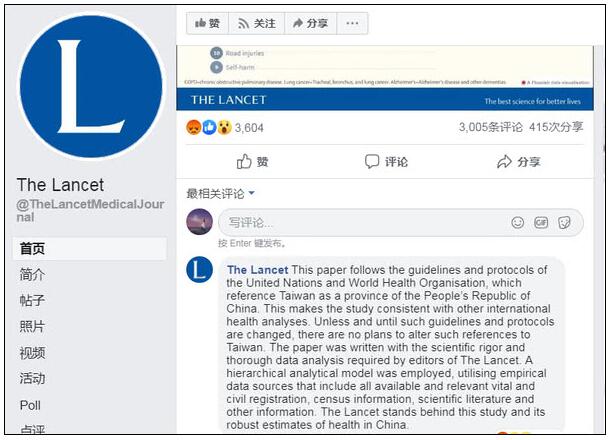 《柳叶刀》在其脸书评论区回应称,“本论文遵循联合国和世界卫生组织的准则和议定书,将台湾称为中华人民共和国的一个省,和其他国际卫生分析并没有不同;除非这项方针和规定改变,《柳叶刀》并无计划更改对台湾的称呼。”