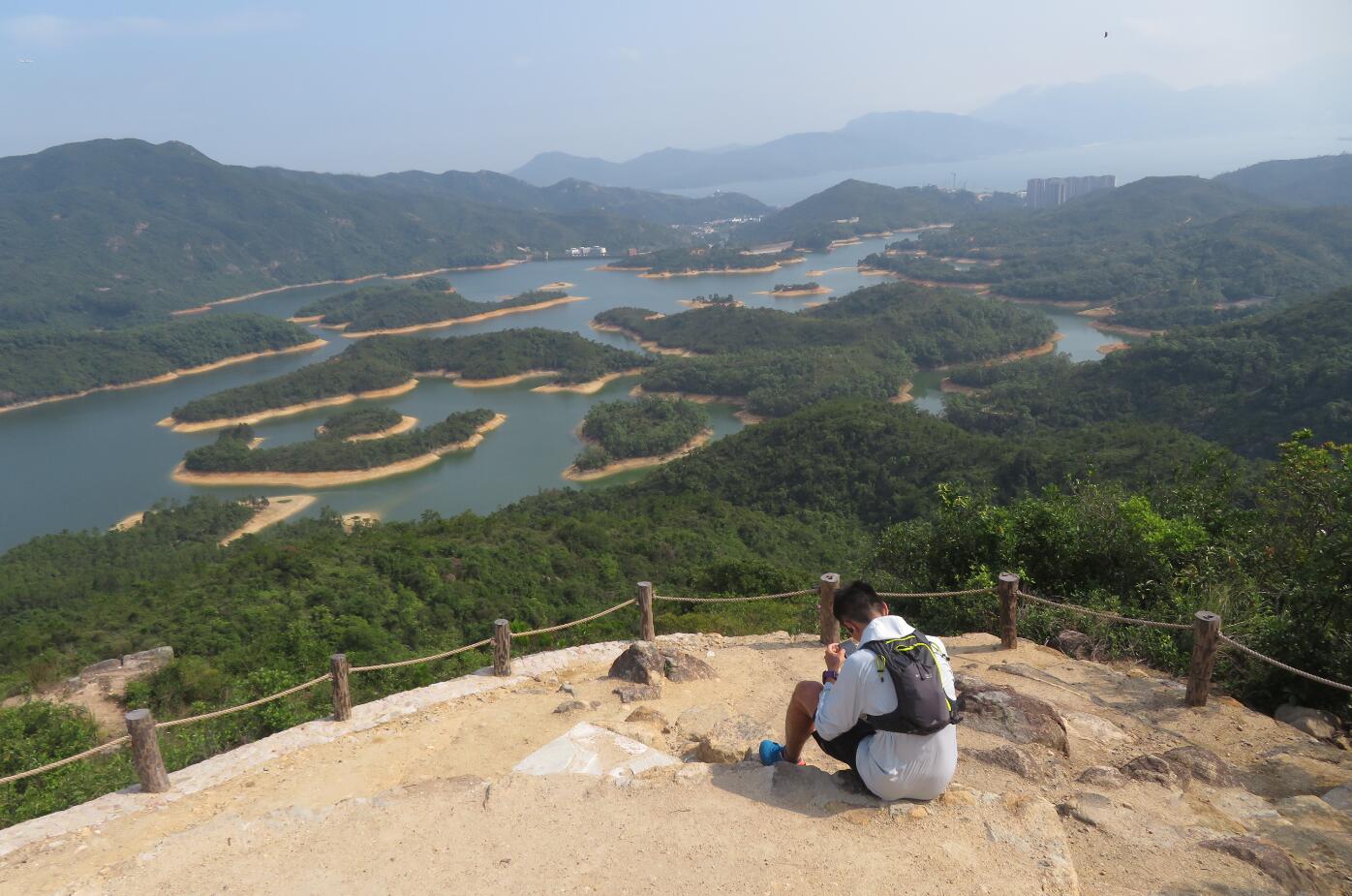 過了塘壩,再踏上麥理浩徑10段,回看水塘如狹長水帶,自有美態。這時發覺徑上山坡的鐵絲網有以千計的豬籠草攀附,蔚為奇觀。一輪瘋狂拍攝後,直走至分叉位,選往大棠方向,走十來分鐘便到千島湖清景台。以往要睹湖中小島美景,遊人喜自發探路,攀上陡峭的山坡,在茂密的植物間觀賞。原來這情況早引起漁護署的關注。該署表示,去年在合適的位置建造觀景台,名為「千島湖清景台」(清景台),以便市民能輕鬆、安全和近距離欣賞到千島湖的全貌。清景台由去年11月初開始動工,今年3月中旬完成並開始對外開放。