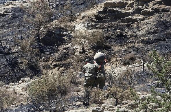 北塞浦路斯军方成员搬运坠落导弹的残骸。