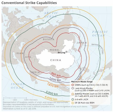 美国国防部评估出的中国常规武装力量打击范围。图源:美国政府