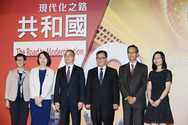 劉江華(左三)、王春法(右三)及盧新寧(左二)等出席「現代化之路──共和國七十年」展覽開幕禮。記者馮俊文攝