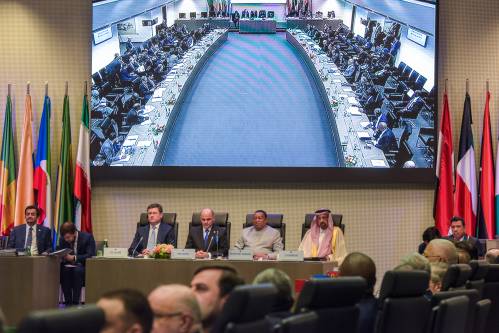 這是7月2日在奧地利維也納拍攝的石油輸出國組織(歐佩克)和非歐佩克產油國部長級會議現場。新華社