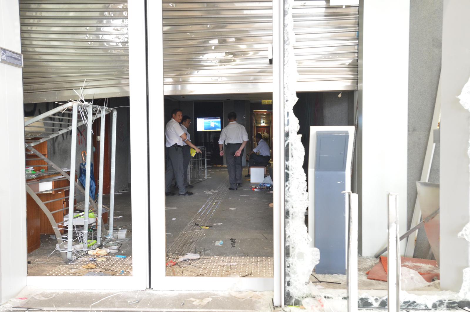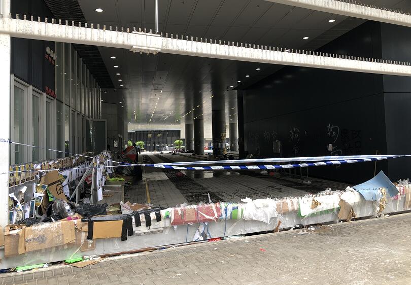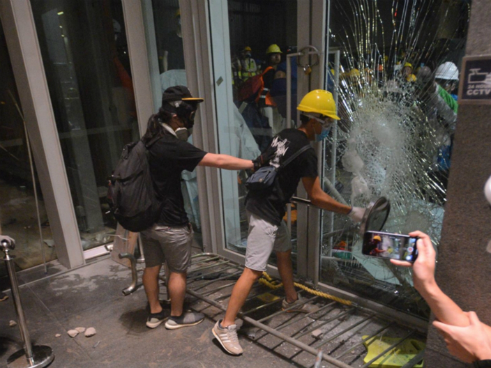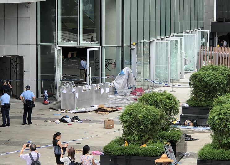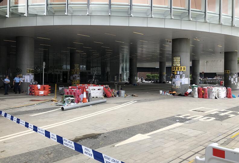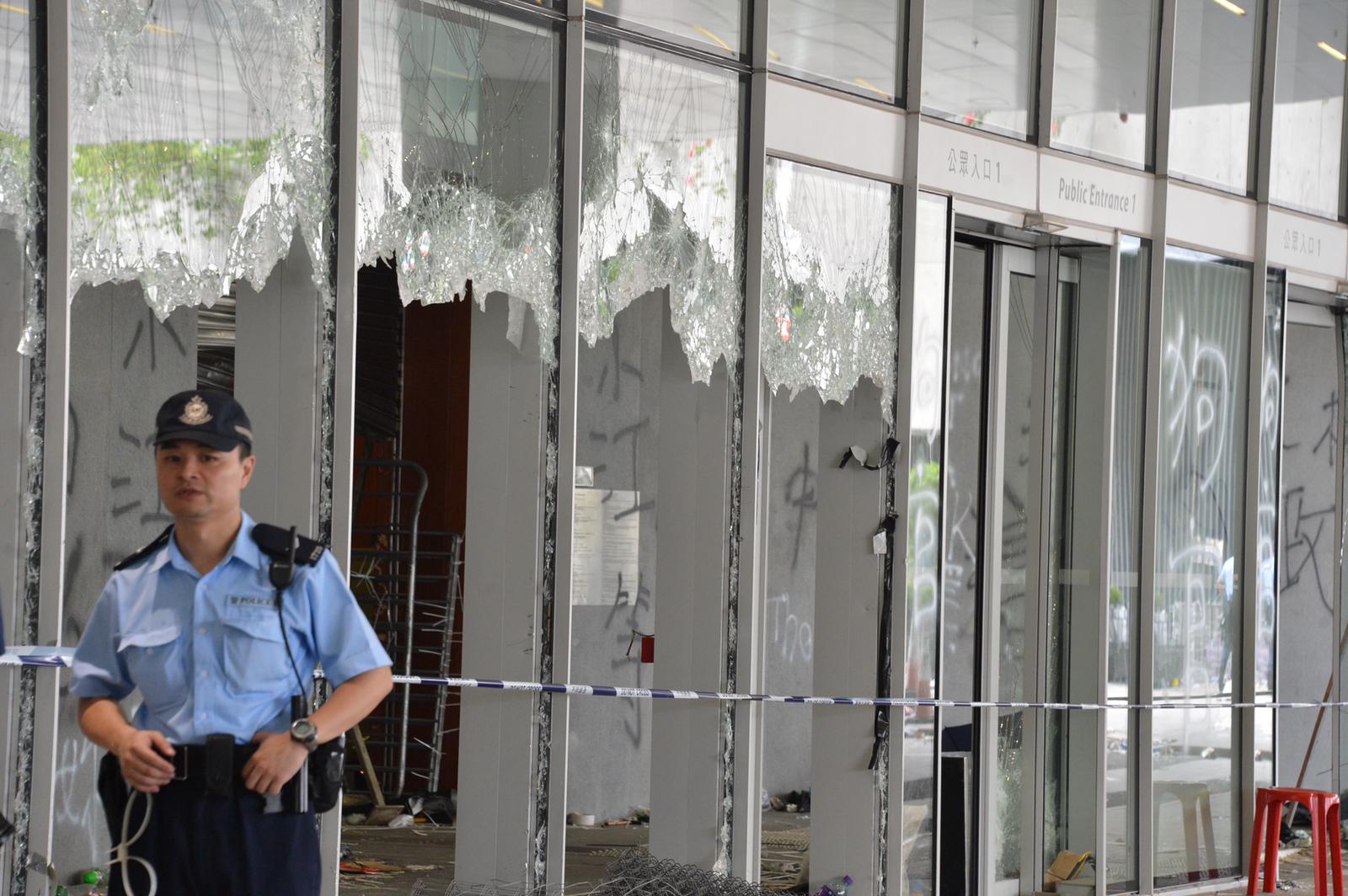 立法會大樓入口的玻璃幕墙幾乎全部破裂,地上布滿玻璃碎片,牆上被噴上示威字句,現場留下大量水馬、鐵枝和磚頭,还有水樽、頭盔、口罩和雨傘等物品。直到今日,工人开始维修立法会大楼外的玻璃幕墙。