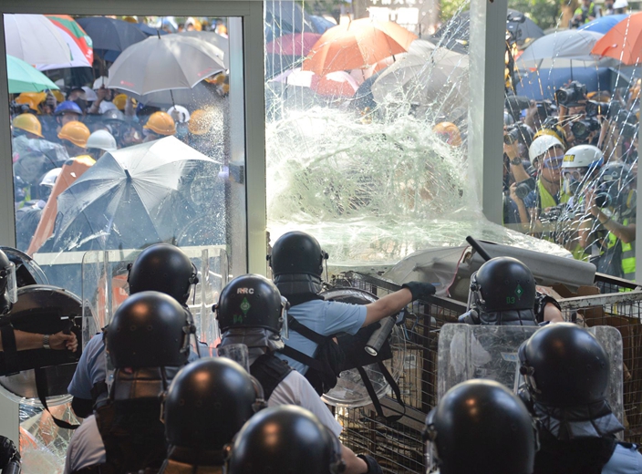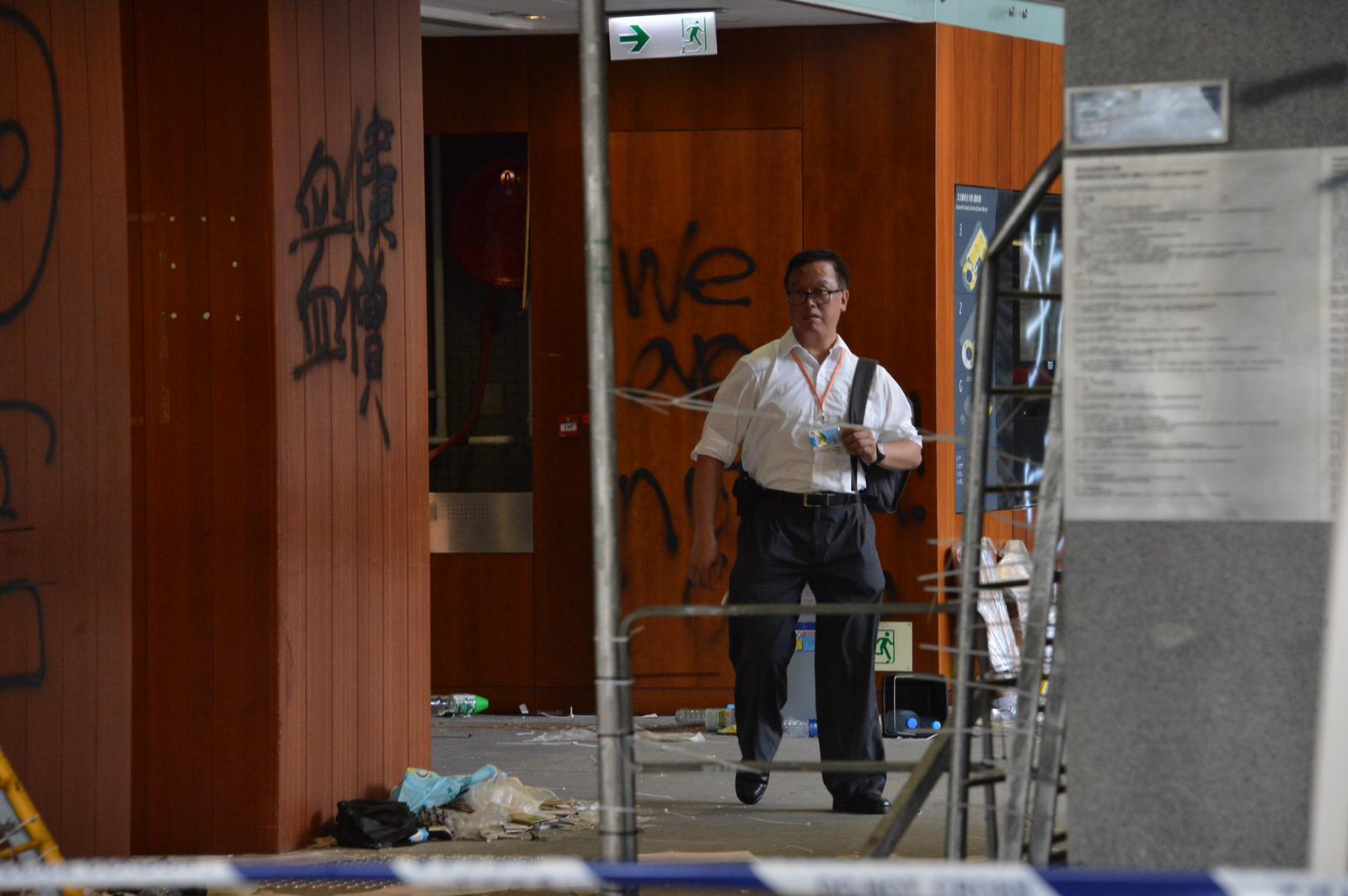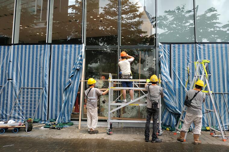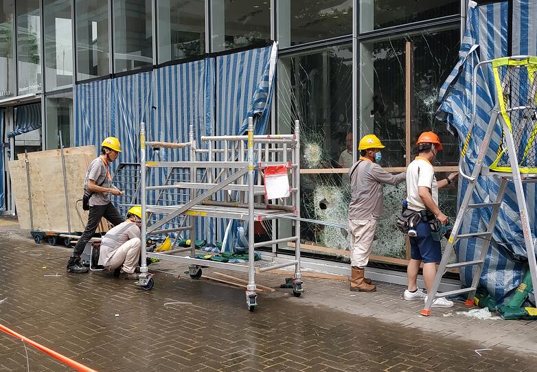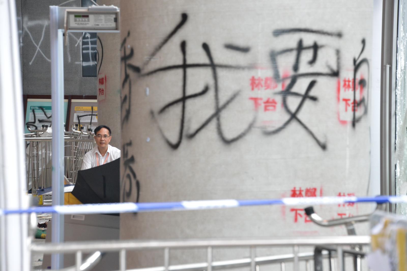 立法會大樓入口的玻璃幕墙幾乎全部破裂,地上布滿玻璃碎片,牆上被噴上示威字句,現場留下大量水馬、鐵枝和磚頭,还有水樽、頭盔、口罩和雨傘等物品。直到今日,工人开始维修立法会大楼外的玻璃幕墙。