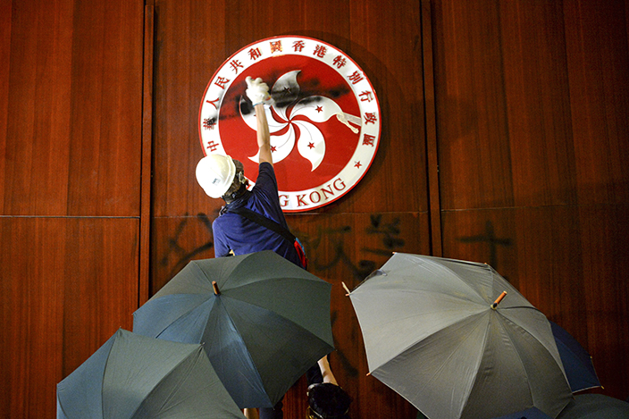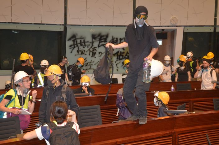 他又指,《立法會權力及特權法》第二十條列明「進入或企圖進入會議廳或會議廳範圍」,最高可判處三個月監禁。執業大律師石書銘補充称,有示威者向警方施放白色冒煙物,最低程度可被控普通襲擊,或被判一年刑期。至於有人涂黑議事廳的特區區徽,他表示相關人士可能違反《區旗及區徽條例》,任何人公開及故意以焚燒、毀損、塗劃、玷污、踐踏等方式侮辱區旗或區徽,最高刑罰可判監三年及罰款五萬元。