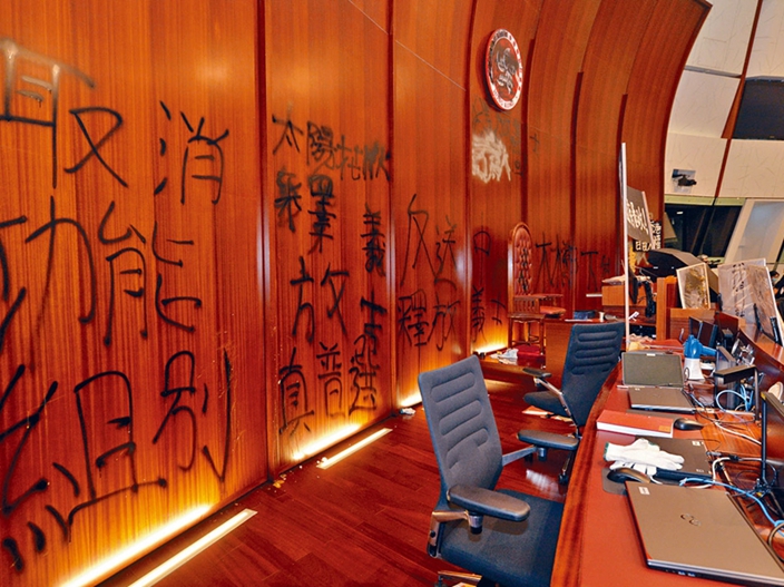 一大批极端激进示威分子7月1日暴力冲击、破坏立法会大樓后,留下了“一地鸡毛”,大樓多處地方滿目瘡痍,内部設施損毁嚴重。立法會財務委員會主席兼保險界議員陳健波評估,立法會大樓这次的維修費用將以數以千萬元計,仅電腦和軟件損耗就需要一億元翻新。
