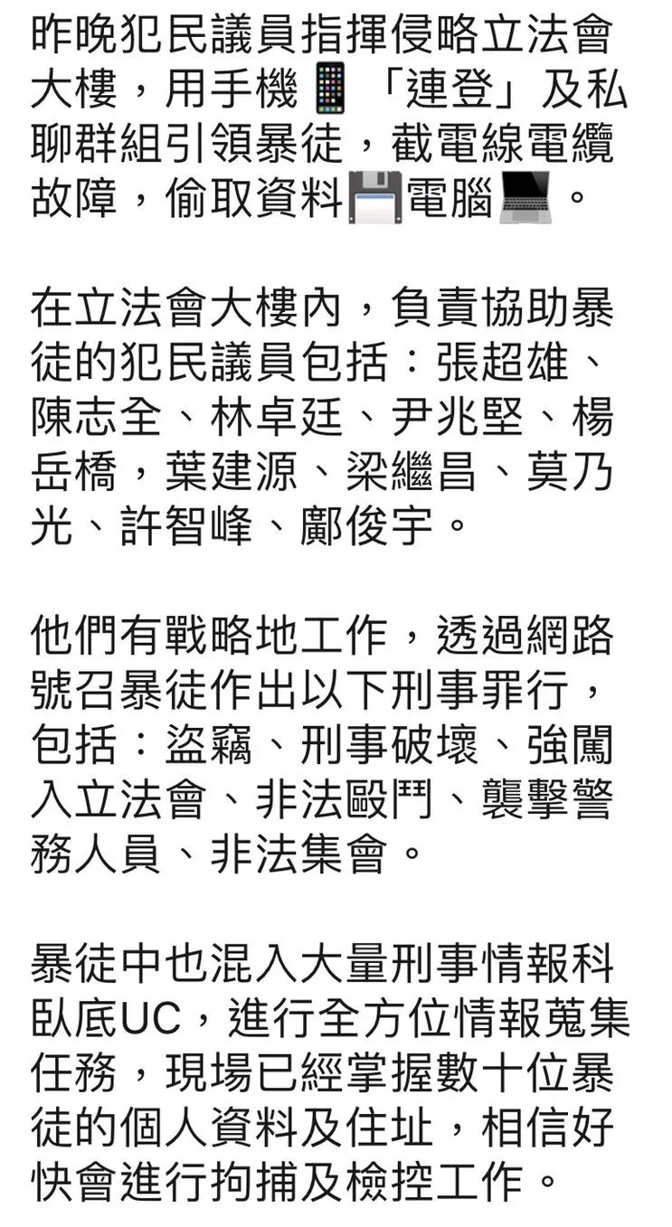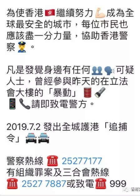另外,不少網民昨日通過網上討論區和社交媒體發起「全城護港追捕令」呼籲市民舉報身旁疑有份參與違法行為的示威者。