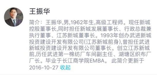 此外,值得一提的是,2016年1月,新城控股曾公告称,该公司董事长王振华因个人原因,正在接受常州市武进区纪委调查,并强调此事“与公司经营无关“。半月之后,王振华结束调查,回归公司。