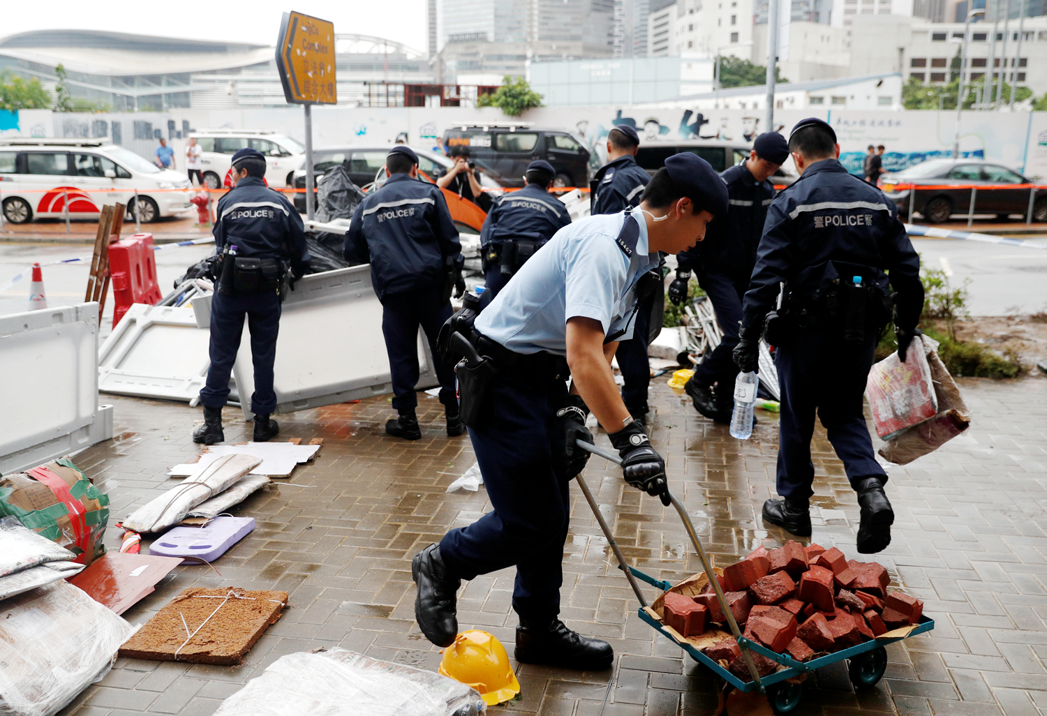 警方於立法會大樓內外蒐集暴徒衝擊證據,圖為警員運走一批磚頭。路透社