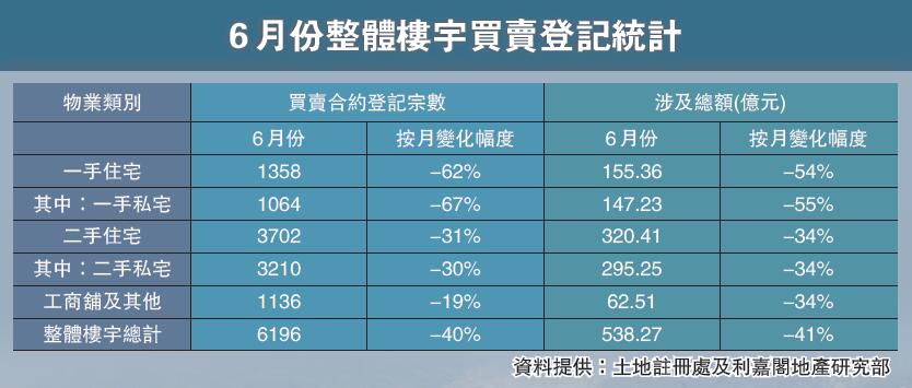 根據土地註冊處最新數字,上月樓宇買賣合約登記錄6211宗,總成交金額538.2億元,按月跌40.0%及40.4%。與2018年同期比較,6月份登記宗數及金額下跌32%及33%。而相較5月份,6月的登記顯著減少,結束連續2個月錄約1萬宗及900億元的高位。同時,宗數及金額均創今年3月後三個月的新低。