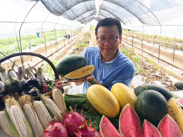 漁護署農業主任陳益民展示西瓜「超甜黑美人168」、「黛安娜」及首次引入的「哈密」。實習記者黃港俊攝