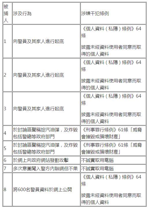 據悉,在被拘捕的9人中,兩名男子涉嫌未經同意披露他人資料,包括在網上上載警務人員照片及其家人資料;一名男子涉嫌把一名警員及其家人資料放上網;一名男子涉嫌網上攻擊警察網頁;一名女子則「不斷撞密碼」試圖登入警方內聯網,涉嫌不誠實取用電腦。餘下一男一女涉嫌蓄意或威脅毀壞財物,在網上討論區及Telegram聲言在示威地點放置危險物品等;第八名被捕男子上載了600名警務人員的資料上網。