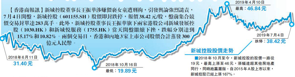 【香港商報网訊】新城控股董事長王振華涉嫌猥褻女童遭刑拘,引發輿論強烈譴責,7月4日開盤,新城控股(601155.SH)股價即封跌停,報價38.42元/股,盤前集合競價交易封單達283萬手。此外,新城控股董事長王振華旗下兩家港股公司新城發展控股(1030.HK)和新城悅服務(1755.HK)當天開盤繼續下挫,跌幅分別達到15.17%和10.82%。兩個交易日,香港和內地3家上市公司股價合計蒸發300億元人民幣。
