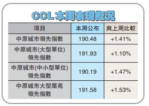 中原城市大型屋苑領先指數CCL Mass報191.58點,按周升1.53%。CCL(中小型單位)報190.19點,按周升1.47%。CCL(大型單位)報191.93點,按周升1.10%。CCL、CCL Mass及CCL(中小型單位)齊升三周,分別上升2.27%、2.28%及2.30%。