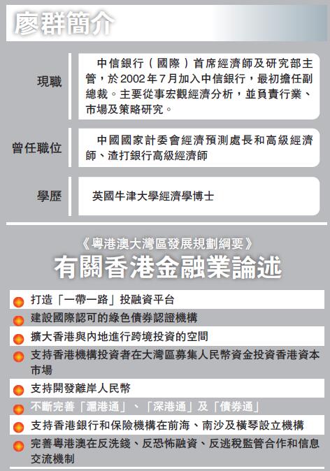 中央為了構建粵港澳大灣區,容許內地與香港資金相互「過河」投資對方產品,惹起外間擔心一旦內地過度開放,將衝擊兩地金融穩定。為解決上述問題,中信銀行(國際)首席經濟師廖群建議,在大灣區實施「封閉管道」,避免內地資本管制受到衝擊之餘,也可確保香港股市不會出現動蕩。